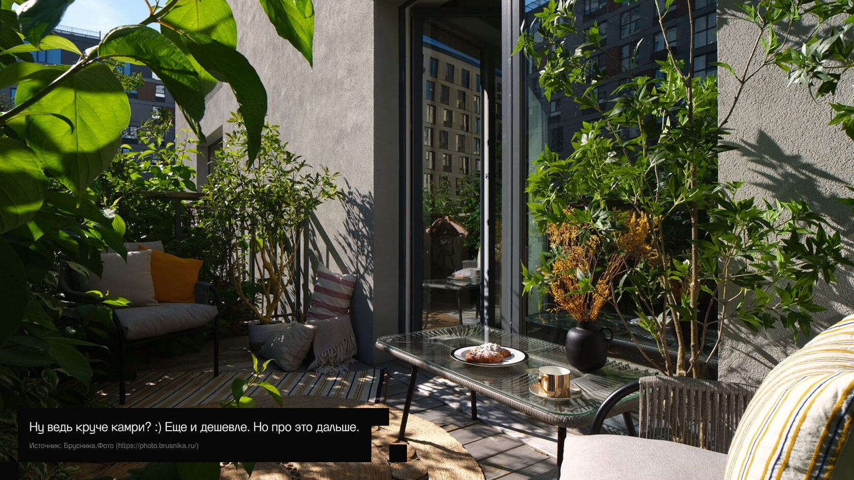 Я же хочу этой статьей обратиться ко всем, кто интересуется покупкой квартир: присмотритесь к террасам и балконам! Стимул застройщиков спросом жителей на них сделает наши города богаче, сценарии жизни разнообразнее. Даже если отбросить все то, что написано выше - открытые летние помещения сделают вашу жизнь красивее и интереснее. Наполнит её новыми сценариями: свежим утром с чашкой кофе на открытом воздухе в тапочках или подарками под заснеженной елкой на Новый год. Это все можно иметь сегодня не только в частном доме, но и в квартире с террасой.